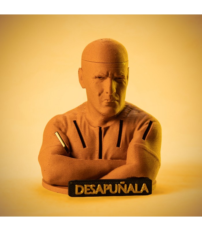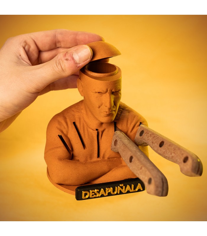 Porta cuchillos Albacete style. A veces a los mamporreros les enfadan que se haga sátira sobre ellos, por eso mismo este porta cuchillos no representa a ningún calvo en concreto. Además de los soportes incluye un compartimiento en la zona donde debería estar el cerebro para guardar cosas, cosas como medio pollo por ejemplo.