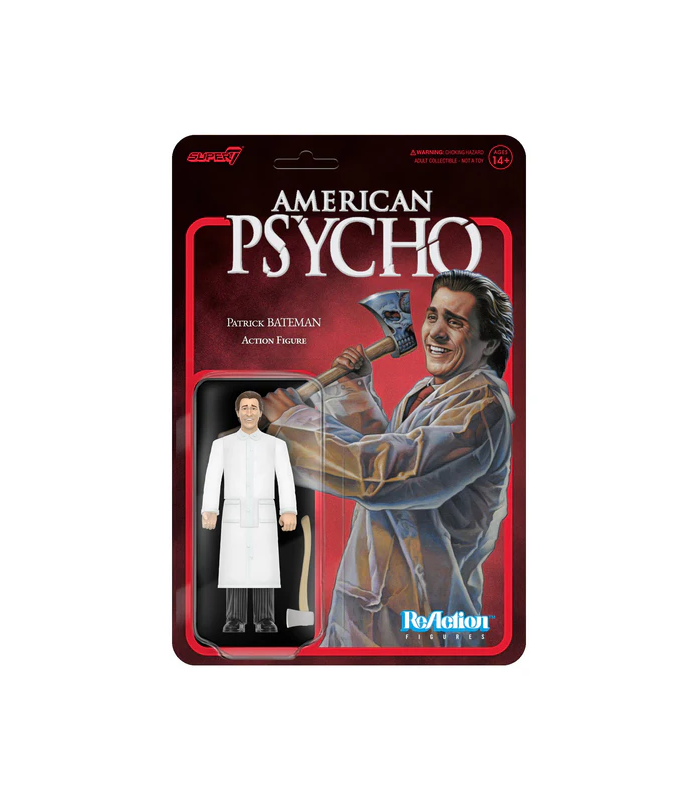 Patrick Bateman no consigue reserva en Dorsia y, sin duda, no lo está llevando muy bien. Esta figura articulada ReAction de Patrick Bateman, de 9,5 cm (3,75 pulgadas), inspirada en la película de terror y comedia del año 2000, presenta al desquiciado banquero de inversiones neoyorquino con pantalones de traje y un impermeable para evitar que se cubra de sangre, e incluye un hacha. Con un blíster que incluye una tarjeta de visita recortable (en blanco hueso, por supuesto), ¡esta figura ReAction de Patrick Bateman será una pieza imprescindible para tu colección!
