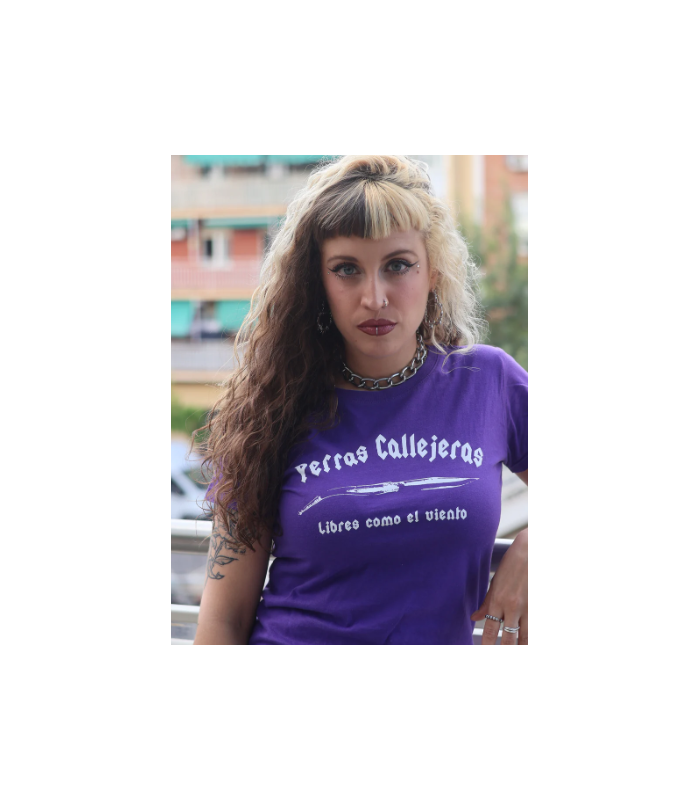 Camiseta entallada morada con serigrafia en el pecho.