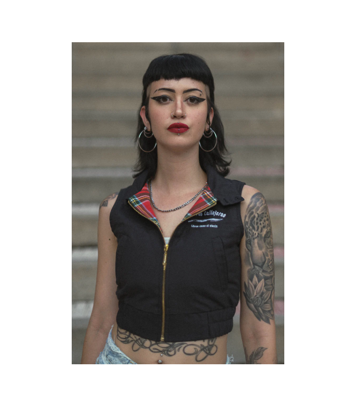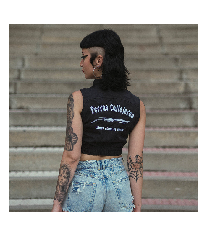 Un chaleco «harrington» crop top, entallado y con el logo bordado. Tanto en la espalda en grande como delante en pequeño